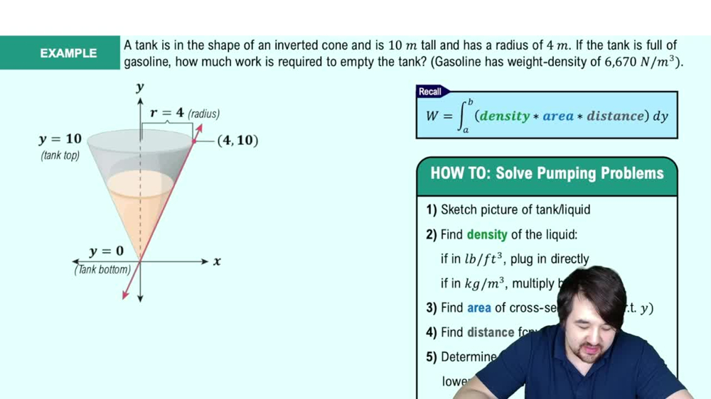 Divide the water in the tank into thin horizontal slices, each with a small thickness \(\Delta y\), so that the weight of each slice can be approximated and the distance it must be lifted can be determined.