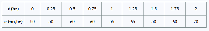 Displacement from a table of velocities The velocities (in mi/hr) of an automobile moving along a straight highway over a two-hour period are given in the following table.