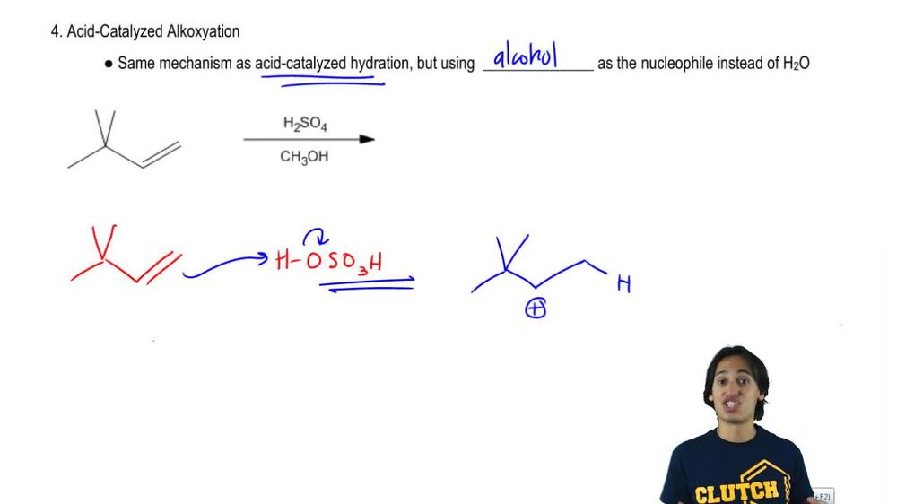 Alkoxylation is a chemical reaction where an alkene reacts with an alcohol in the presence of an acid catalyst to form an ether. This process involves the formation of a carbocation intermediate, which can then react with the alcohol to yield the ether product. Recognizing the mechanism of alkoxylation is essential for preparing ethers from alkenes, as it highlights the importance of regioselectivity and stereochemistry in the reaction.