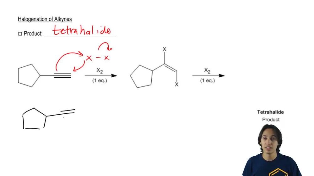Halogenation is a reaction where halogens, such as chlorine (Cl₂), react with unsaturated hydrocarbons. In the case of alkynes, the addition of Cl₂ can lead to the formation of dihaloalkenes or even saturated compounds, depending on the conditions. When one equivalent of Cl₂ is added to an alkyne, it typically results in the formation of a vinyl halide and a potential further reaction product.