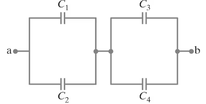 Step 1: Analyze the circuit configuration. The circuit consists of two pairs of capacitors connected in parallel (C1 and C2, C3 and C4), and these pairs are connected in series between points a and b.