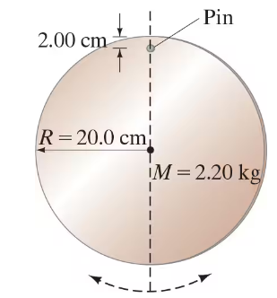 A plywood disk of radius 20.0 cm and mass 2.20 kg has a small hole drilled through it, 2.00 cm from its edge (Fig. 14–38). The disk is hung from the wall by means of a metal pin through the hole, and is used as a pendulum. What is the period of this pendulum for small oscillations?