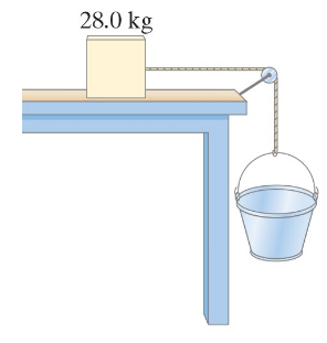 A 28.0-kg block is connected to an empty 2.00-kg bucket by a cord running over a frictionless pulley (Fig. 5–56). The coefficient of static friction between the table and the block is 0.42 and the coefficient of kinetic friction between the table and the block is 0.34. Sand is gradually added to the bucket until the system just begins to move. Calculate the mass of sand added to the bucket.