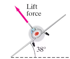 Step 3: Relate the centripetal force to the banking angle. The centripetal force is provided by the horizontal component of the lift force. Use the equation \( F_c = \frac{mv^2}{r} \), where \( r \) is the radius of the circular path. The lift force \( L \) is related to the banking angle \( \theta \) by \( L \sin(\theta) = F_c \). Rearrange to solve for \( r \): \( r = \frac{v^2}{g \tan(\theta)} \), where \( g \) is the acceleration due to gravity (9.8 m/s²).