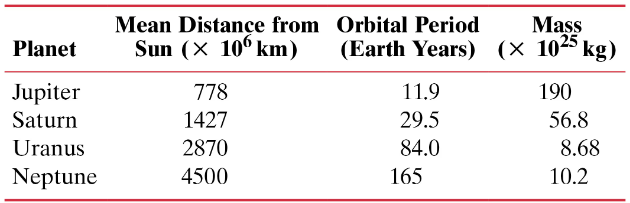 Most of our Solar System’s mass is contained in the Sun, and the planets possess almost all of the Solar System’s angular momentum. This observation plays a key role in theories attempting to explain the formation of our Solar System. Estimate the fraction of the Solar System’s total angular momentum from the planets using a simplified model which includes only the large outer planets with the most angular momentum. The central Sun (mass 1.99 x 1030 kg, radius 6.96 x 108 m ) spins about its axis once every 25 days and the planets Jupiter, Saturn, Uranus, and Neptune move in nearly circular orbits around the Sun with orbital data given in the Table below. Ignore each planet’s spin about its own axis.