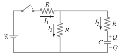 (II) Consider the circuit shown in Fig. 26–67, where all resistors have the same resistance R. At t = 0, with the capacitor C uncharged, the switch is closed. At t = ∞, the currents can be determined by analyzing a simpler, equivalent circuit. Identify this simpler circuit and implement it in finding the values of I1, I2 and I3 at t = ∞.