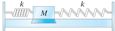 (III) A glider on an air track is connected by springs to either end of the track (Fig. 14–41). Both springs have the same spring constant, k, and the glider has mass M.(k = 125 N/m and M = 215 g). How long does it take the amplitude to decrease to one-quarter of its initial value?