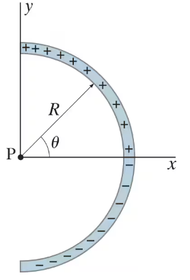 Step 1: Understand the problem setup. The semicircular glass rod has a nonuniform linear charge density λ = λ₀ sin θ, where λ₀ is a positive constant. The charge distribution is symmetric about the y-axis, with positive charges on the upper half and negative charges on the lower half. Point P is at the center of the semicircle, and we need to calculate the electric field at P due to this charge distribution.