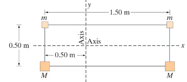 Calculate the moment of inertia of the array of point objects shown in Fig. 10–58 about the x axis. Assume m = 22kg, M = 3.2kg, and the objects are wired together by very light, rigid pieces of wire. The array is rectangular and is split through the middle by the x axis.