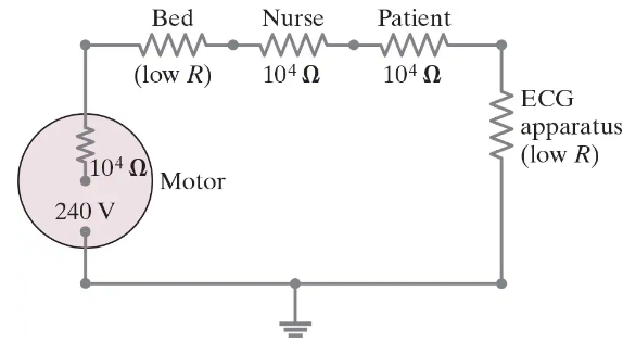 Electricity can be a hazard in hospitals, particularly to patients who are connected to electrodes, such as an ECG. Suppose that the motor of a motorized bed shorts out to the bed frame, and the bed frame’s connection to a ground has broken (or was not there in the first place). If a nurse touches the bed and the patient at the same time, the nurse becomes a conductor and a complete circuit can be made through the patient to ground through the ECG apparatus. This is shown schematically in Fig. 26–79. Calculate the current through the patient.
