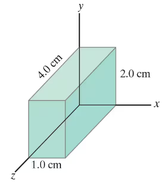 (II) A rectangular solid made of carbon has sides of lengths 1.0 cm, 2.0 cm, and 4.0 cm, lying along the x, y, and z axes, respectively (Fig. 25–36). Determine the resistance for current that passes through the solid in the x direction (Assume the resistivity is ρ = 3.0 x 10-5 Ω m).