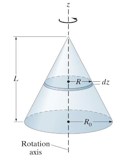 (III) Determine the moment of inertia of a uniform solid cone whose base has radius R0, height L and mass M. The axis of rotation (𝒵) is the symmetry axis perpendicular to the base, Fig. 10–66. [Hint: Think of the cone as a stack of infinitesimally thin disks of mass dm, radius R, and thickness dz.]