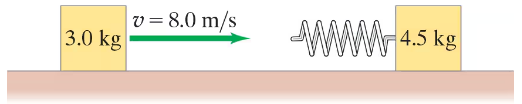 A 3.0-kg block slides along a frictionless tabletop at 8.0 m/s toward a second block (at rest) of mass 4.5 kg. A coil spring, which obeys Hooke’s law and has spring constant k = 850 N/m, is attached to the second block in such a way that it will be compressed when struck by the moving block, Fig. 9–43. Is the collision elastic? Ignore the mass of the spring.