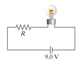 A flashlight bulb rated at 2.0 W and 3.0 V is operated by a 9.0-V battery. To light the bulb at its rated voltage and power, a resistor R is connected in series as shown in Fig. 26–81. What value should the resistor have?