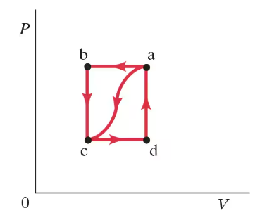 In the process of taking a gas from state a to state c along the curved path shown in Fig. 19–33, 85 J of heat leaves the system and 55 J of work is done on the system. Determine the change in internal energy, .