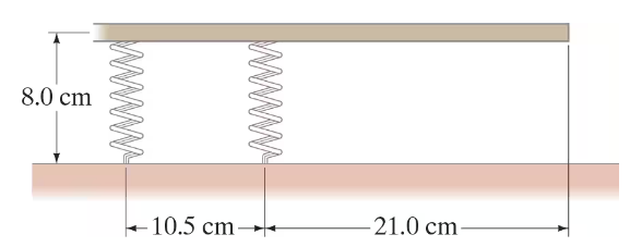 Two springs, both having stiffness constant 225 N/m, are attached to a table and to a 0.500-kg uniform thin wooden board (Fig. 12–98). The board is exactly horizontal. What are the natural lengths of each spring? [Hint: One of the springs is stretched, the other compressed, from their natural equilibrium lengths.]