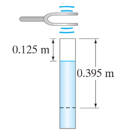 A tuning fork is set into vibration above a vertical open tube filled with water (Fig. 16–41). The water level is allowed to drop slowly. As it does so, the air in the tube above the water level is heard to resonate with the tuning fork when the distance from the tube opening to the water level is 0.125 m and again at 0.395 m. What is the frequency of the tuning fork?