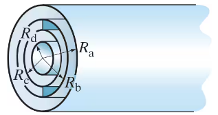 Determine the effective radii: \( R_{\text{inner}} = R_a \), the radius of the innermost cylinder. For the outer conductor, the effective radius is \( R_d \), the radius of the outermost cylinder, because the b-c structure is at the same potential as d due to the connection.
