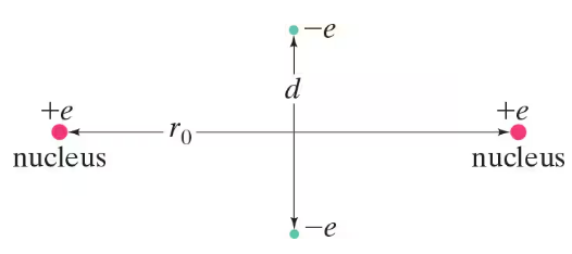 A simple picture of an H₂ molecule sharing two electrons is shown in Fig. 40–56. We assume the electrons are symmetrically located between the two protons, which are separated by r₀ = 0.074 nm. When the electrons are separated by a distance d, write the total potential energy U in terms of d and r0.