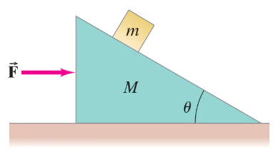 A small block of mass m rests on the rough, sloping side of a triangular block of mass M which itself rests on a horizontal frictionless table as shown in Fig. 5–44. If the coefficient of static friction is μ, determine the minimum horizontal force F applied to M that will cause the small block m to start moving up the incline.