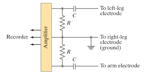 Electrocardiographs are often connected as shown in Fig. 26–78. The lead wires to the legs are said to be capacitively coupled. A time constant of 3.0 s is typical and allows rapid changes in potential to be recorded accurately. If C = 3.0μF, what value must R have? [Hint: Consider each leg as a separate circuit.]