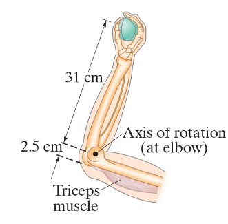 Assume that a 1.00-kg ball is thrown solely by the action of the forearm, which rotates about the elbow joint under the action of the triceps muscle, Fig. 10–57. The ball is accelerated uniformly from rest to 8.5 m/s in 0.38 s, at which point it is released. Calculate the force required of the triceps muscle. Assume that the forearm has a mass of 3.7 kg and rotates like a uniform rod about an axis at its end.