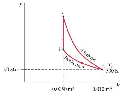 Step 1: Begin by identifying the given values from the diagram. At point 'a', the pressure \( P_a \) is 1.0 atm, the volume \( V_a \) is 0.010 m³, and the temperature \( T_a \) is 300 K. Convert the pressure from atm to Pascals using the conversion factor \( 1 \, \text{atm} = 1.013 \times 10^5 \, \text{Pa} \).