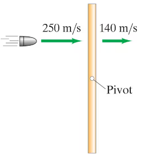 A uniform stick 1.0 m long with a total mass of 270 g is pivoted at its center. A 3.5-g bullet is shot through the stick midway between the pivot and one end (Fig. 11–37). The bullet approaches at 250 m/s and leaves at 140 m/s. With what angular speed is the stick spinning after the collision?