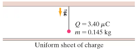 A point charge of mass 0.145 kg, and net charge +3.40 μC, hangs at rest at the end of an insulating cord above a large sheet of charge. The horizontal sheet of fixed uniform charge creates a uniform vertical electric field in the vicinity of the point charge. The tension in the cord is measured to be 5.18 N. (a) Calculate the magnitude and direction of the electric field due to the sheet of charge (Fig. 21–80). (b) What is the surface charge density σ(C/m²) on the sheet?
