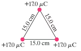 Step 1: Identify the forces acting on one particle due to the other two. Since the charges are identical and located at the corners of an equilateral triangle, the forces will be repulsive and directed along the lines connecting the charges. Use Coulomb's law to calculate the magnitude of the force between two charges: \( F = \frac{k \cdot q_1 \cdot q_2}{r^2} \), where \( k \) is Coulomb's constant \( (8.99 \times 10^9 \; \text{N·m}^2/\text{C}^2) \), \( q \) is the charge \( (17.0 \; \mu\text{C} = 17.0 \times 10^{-6} \; \text{C}) \), and \( r \) is the distance between charges \( (15.0 \; \text{cm} = 0.15 \; \text{m}) \).