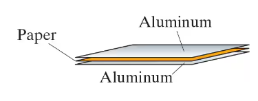 Paper has a dielectric constant K = 3.7 and a dielectric strength of 15 x 106 V/m. Suppose that a typical sheet of paper has a thickness of 0.11 mm. You make a “homemade” capacitor by placing a sheet of 21 cm x 14 cm paper between two aluminum foil sheets (Fig. 24–40) of the same size. What is the capacitance C0 of your device?