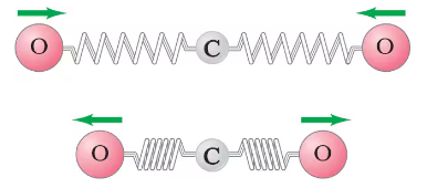 Carbon dioxide is a linear molecule. The carbon–oxygen bonds in this molecule act very much like springs. Figure 14–45 shows one possible way the oxygen atoms in this molecule can oscillate: the oxygen atoms oscillate symmetrically in and out, while the central carbon atom remains at rest. Hence each oxygen atom acts like a simple harmonic oscillator with a mass equal to the mass of an oxygen atom. It is observed that this oscillation occurs with a frequency of ƒ = 2.83 x 1013 Hz. What is the spring constant of the C-O bond?