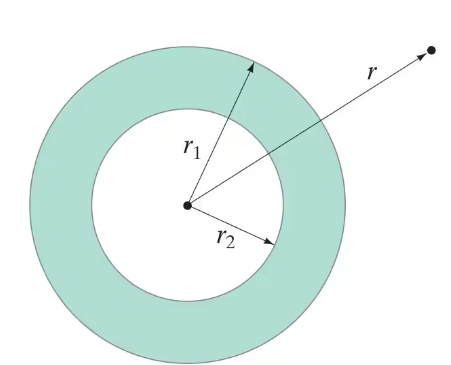 Use the shell theorem: The shell theorem states that for a spherically symmetric mass distribution, the gravitational field outside the shell behaves as if all the mass were concentrated at the center. Since r > r₁, the entire mass M of the shell can be treated as if it were concentrated at the center of the sphere.