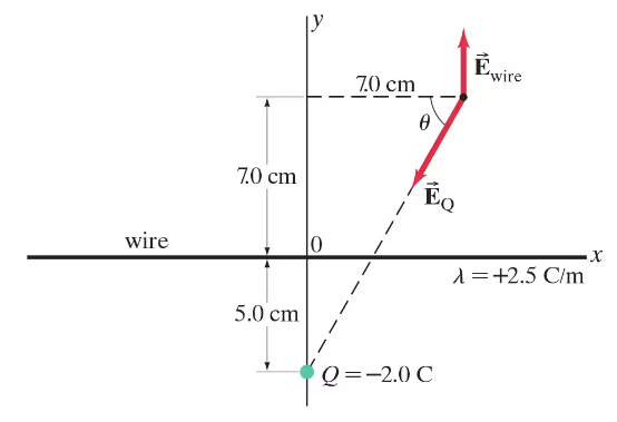 Step 5: Combine the electric field vectors. Add the components of E_wire and E_q to find the net electric field at the point (x = 7.0 cm, y = 7.0 cm). Use vector addition: , where E_x and E_y are the x and y components of the net electric field. The direction of the net field can be found using the angle: .