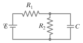 Step 1: Identify the components in the circuit. The circuit consists of a battery with emf \( \mathcal{E} \), two resistors \( R_1 \) and \( R_2 \), and a capacitor \( C \). The resistors are connected in series, and the capacitor is connected in parallel with \( R_2 \).