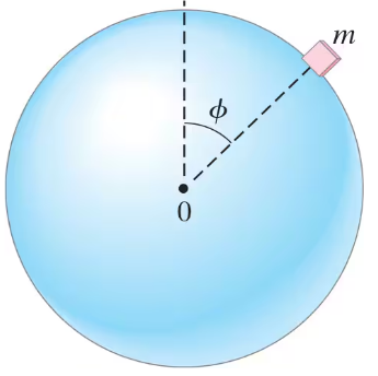 A small mass m is set on the surface of a sphere, Fig. 5–54. If the coefficient of static friction is μs = 0.70, at what angle Ø would the mass start sliding?
