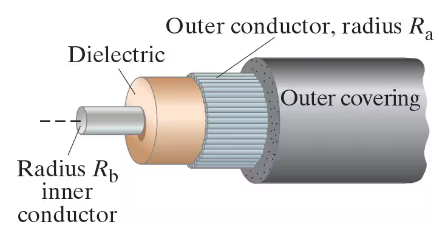 A coaxial cable, Fig. 24–35, consists of an inner cylindrical conducting wire of radius Rb surrounded by a dielectric insulator. Surrounding the dielectric insulator is an outer conductor of radius Rₐ, which is usually “grounded.” For a given cable, Rb = 2.5 mm and Ra = 9.0 mm. The dielectric constant of the dielectric insulator is K = 3.2. Suppose that there is a potential of 1.0 kV between the inner conducting wire and the outer conducting sheath. Find the charge, and capacitance, per meter of the cable.