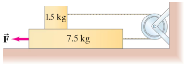 A 1.5-kg block rests on top of a 7.5-kg block (Fig. 4–70). The cord and pulley have negligible mass, and there is no significant friction anywhere. What is the tension in the connecting cord?