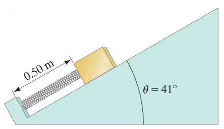 (III) A spring ( k = 75 N/m) has an equilibrium length of 1.00 m. The spring is compressed to a length of 0.50 m and a mass of 2.0 kg is placed at its free end on a frictionless slope which makes an angle of 41° with respect to the horizontal (Fig. 8–41). The spring is then released. If the mass is not attached to the spring, how far up the slope will the mass move before coming to rest?