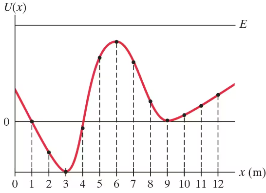 The graph of Fig. 8–43 shows the potential energy curve of a particle moving along the x axis under the influence of a conservative force. Note that the total energy E > U(x), so that the particle’s speed is never zero. At what value of 𝓍 is the magnitude of the force a maximum?