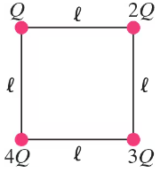 Step 2: Calculate the distances between the charge 2Q and the other charges. The distance between 2Q and Q is ℓ, the distance between 2Q and 3Q is ℓ, and the distance between 2Q and 4Q is the diagonal of the square, which is .