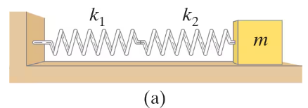 Step 1: Analyze the configuration shown in the image. In part (a), the mass m is connected to two springs in series. This means the effective spring constant of the system, k_eff, must be calculated using the formula for springs in series: \( \frac{1}{k_{eff}} = \frac{1}{k_1} + \frac{1}{k_2} \).