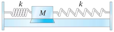 A glider on an air track is connected by springs to either end of the track (Fig. 14–41). Both springs have the same spring constant, k, and the glider has mass M. Determine the frequency of the oscillation, assuming no damping, if k = 125 N/m and M = 215 g.