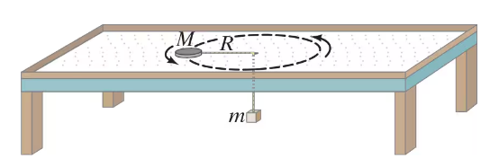 A flat puck (mass M) is revolved in a circle on a frictionless air hockey table top, and is held in this orbit by a light cord which is connected to a dangling mass (mass m) through a central hole as shown in Fig. 5–51. Show that the speed of the puck is given by v = √(mgR/M).