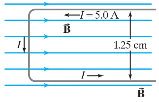 A small but rigid U-shaped wire carrying a 5.0-A current (Fig. 28–67) is placed inside a solenoid. The solenoid is 15.0 cm long and has 600 loops of wire, and the current in each loop is 7.0 A. What is the net force on the U-shaped wire?