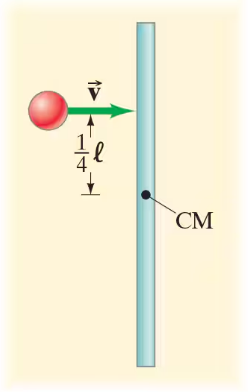 (III) A thin uniform rod of mass M and length ℓ rests on a frictionless table and is struck at a point ℓ/4 from its cm by a clay ball of mass m moving at speed υ (Fig. 11–40). The ball sticks to the rod. Determine the translational and rotational motion of the rod after the collision.