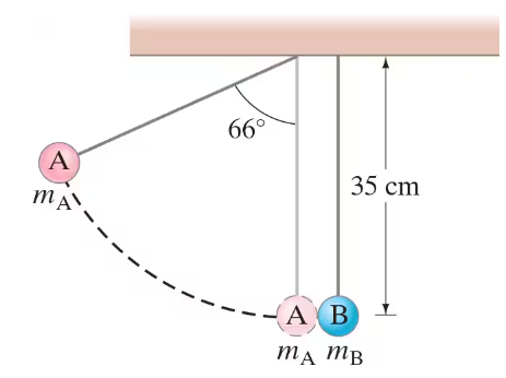 Two balls, of masses mA = 42 g and mB = 96 g, are suspended as shown in Fig. 9–55. The lighter ball is pulled away to a 66° angle with the vertical and released. What is the velocity of the lighter ball before impact?