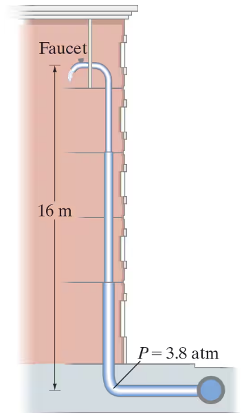 (II) Water at a gauge pressure of 3.8 atm at street level flows into an office building at a speed of 0.78 m/s through a pipe 5.0 cm in diameter. The pipe tapers down to 2.8 cm in diameter by the top floor, 16 m above (Fig. 13–57), where the faucet has been left open. Calculate the gauge pressure in the pipe on the top floor. Assume no branch pipes and ignore viscosity.