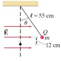 A point charge ( m = 1.5 gram) at the end of an insulating cord of length 55 cm is observed to be in equilibrium in a uniform horizontal electric field of 9500 N/C, when the pendulum’s position is as shown in Fig. 21–79, with the charge 12 cm above the lowest (vertical) position. If the field points to the right in Fig. 21–79, determine the magnitude and sign of the point charge.