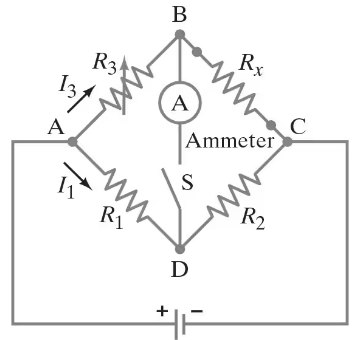 Step 1: Understand the Wheatstone bridge concept. A Wheatstone bridge is balanced when the ratio of resistances in one branch equals the ratio in the other branch. This means that no current flows through the ammeter, and the circuit satisfies the condition: \( \frac{R_1}{R_2} = \frac{R_x}{R_3} \).
